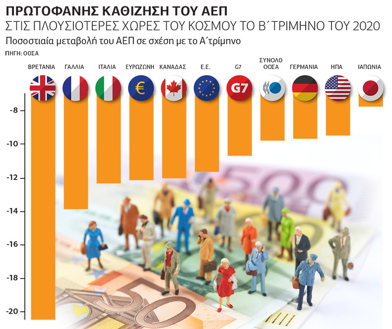Από τις εφτά μεγαλύτερες οικονομίες του κόσμου, τις χειρότερες επιδόσεις είχε η Βρετανία η οποία μετά από συρρίκνωση 2,2% στο α’ τρίμηνο είδε το ΑΕΠ της να βυθίζεται κατά 20,4% στο διάστημα Απριλίου-Ιουνίου. Ακολούθησε η Γαλλία, η οποία μαζί με την Ιταλία ήταν από τις πρώτες χώρες της Ευρώπης που χτύπησε γερά η πανδημία. Το γαλλικό ΑΕΠ συρρικνώθηκε κατά 13,8% στο β’ τρίμηνο μετά από πτώση 5,9% στο α’ τρίμηνο και -0,2% στο δ’ τρίμηνο του 2019.