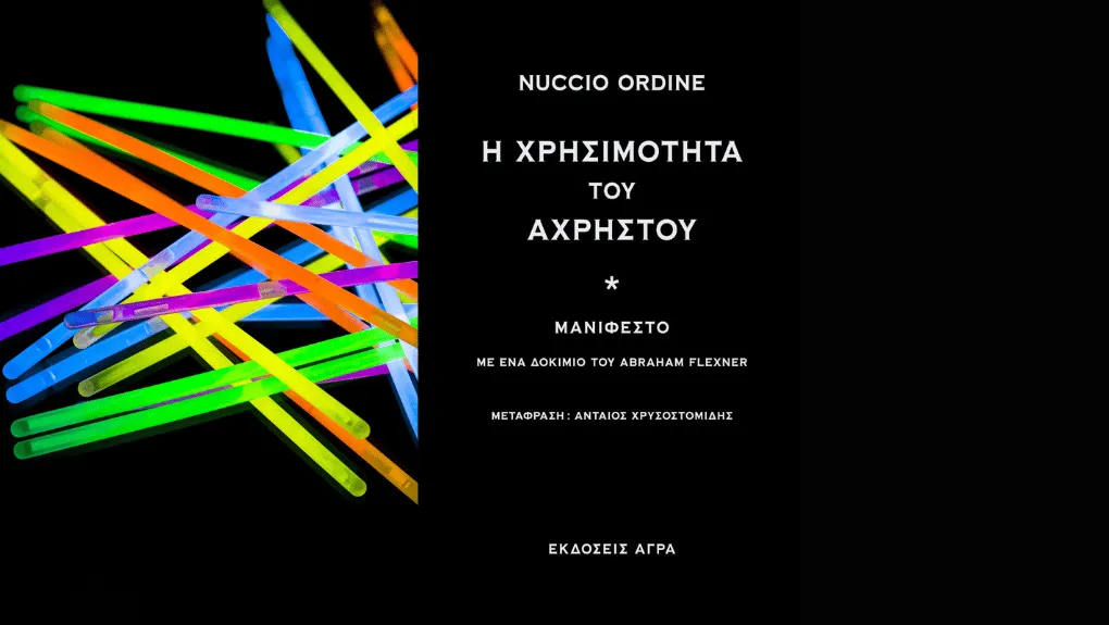 Ο Νούτσιο Ορντινε, καθηγητής ιταλικής λογοτεχνίας στο Πανεπιστήμιο της Καλαβρίας, έχει αφιερώσει ένα ολόκληρο βιβλίο, 220 σελίδων, με τίτλο «Η χρησιμότητα του άχρηστου» (εκδόσεις Αγρα), στην ομορφιά των «άχρηστων γνώσεων», οι οποίες παρ’ όλα αυτά ικανοποιούν την περιέργειά μας και μοιάζουν να κάνουν τη διαφορά. Η χρησιμοθηρία είναι η ασθένεια που ταλανίζει εδώ και αιώνες τις κοινωνίες μας. Τα πάντα προσεγγίζονται από μια ωφελιμιστική σκοπιά, ακόμα και οι άνθρωποι. Το πρώτο ερώτημα που θέτουμε συνήθως είναι: Τι θα κερδίσω εγώ απ’ αυτό; Σε τι θα μου χρησιμεύσει εκείνο; Πώς μπορώ να εκμεταλλευτώ τις ευκαιρίες που μου δίνονται και τους ανθρώπους που μου τις προσφέρουν;